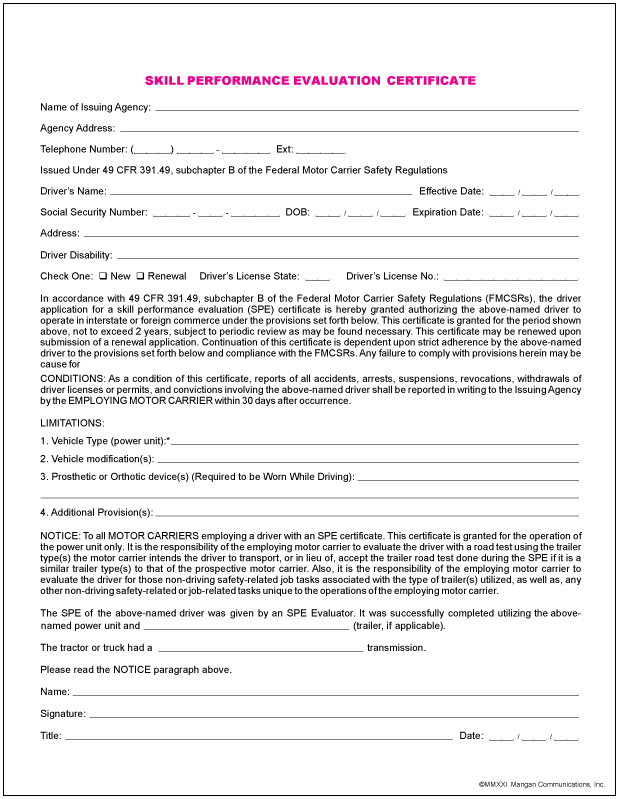 FMCSA may require the driver applicant to demonstrate his or her ability to safely operate the commercial motor vehicle(s) the driver intends to drive to an agent of FMCSA. The SPE certificate form will identify the power unit (bus, truck, truck tractor) for which the SPE certificate has been granted. The SPE certificate forms will also identify the trailer type used in the Skill Performance Evaluation; however, the SPE certificate is not limited to that specific trailer type. A driver may use the SPE certificate with other trailer types if a successful trailer road test is completed in accordance with paragraph (e)(2) of this section. Job tasks, as stated in paragraph (e)(3) of this section, are not evaluated during the Skill Performance Evaluation.
