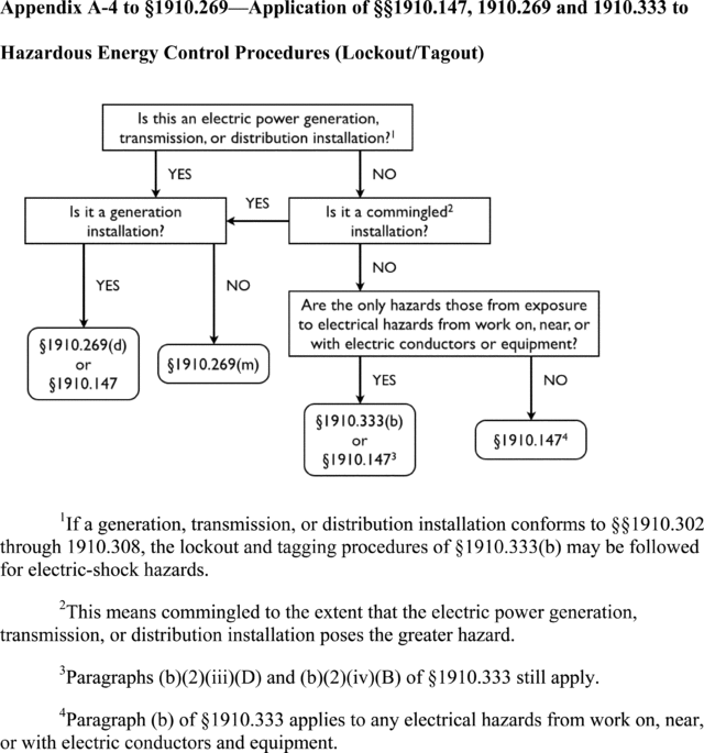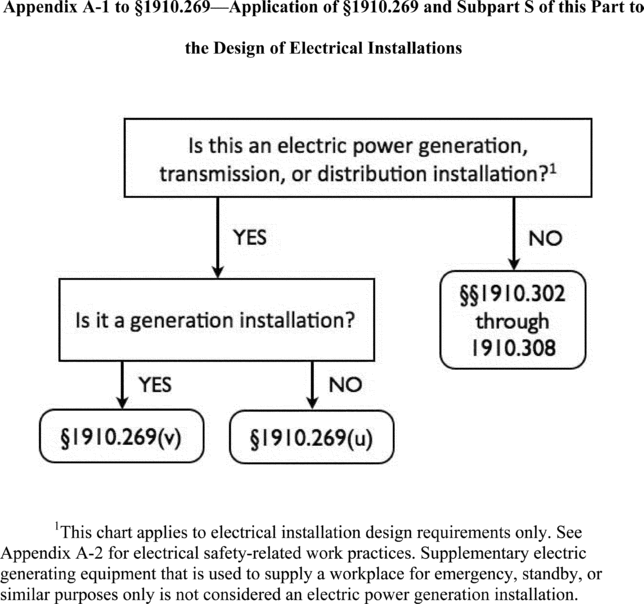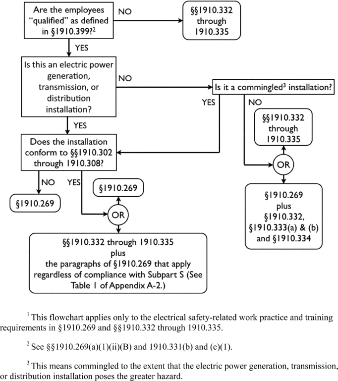 Note 1 to paragraph (a)(1)(ii)(B): The Occupational Safety and Health Administration considers work practices conforming to §§1910.332 through 1910.335 as complying with the electrical safety-related work-practice requirements of §1910.269 identified in Table 1 of Appendix A-2 to this section, provided that employers are performing the work on a generation or distribution installation meeting §§1910.303 through 1910.308. This table also identifies provisions in §1910.269 that apply to work by qualified persons directly on, or associated with, installations of electric power generation, transmission, and distribution lines or equipment, regardless of compliance with §§1910.332 through 1910.335.