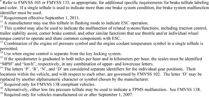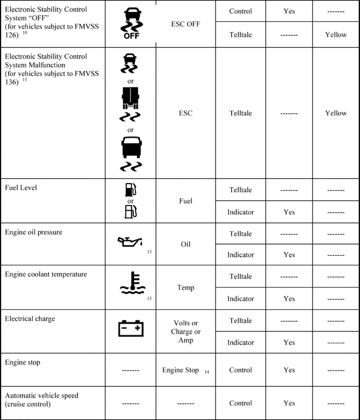 Requirements. Each passenger car, multipurpose passenger vehicle, truck and bus that is fitted with a control, a telltale or an indicator listed in Table 1 or Table 2 must meet the requirements of this standard for the location, identification, color, and illumination of that control, telltale or indicator. However, the requirements for telltales and indicators do not apply to vehicles with GVWRs of 4,536 kg or greater if these specified vehicles are manufactured before September 1, 2013.