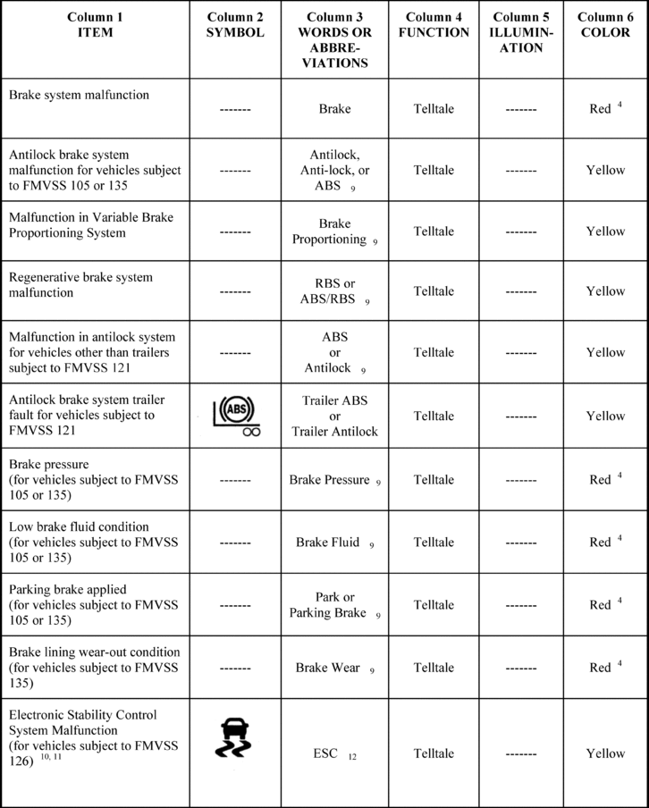 The telltales for any brake system malfunction required by Table 1 to be red, air bag malfunction, low tire pressure, electronic stability control malfunction (as of September 1, 2011), passenger air bag off, high beam, turn signal, and seat belt must not be shown in the same common space.