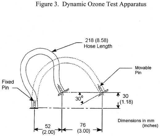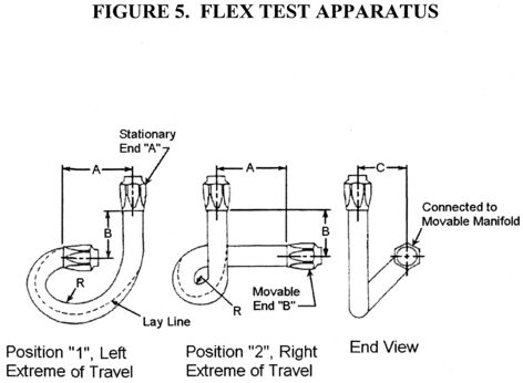 With the tubing assembly inside the environmental chamber, apply compressed air to the tubing assembly at a regulated pressure of 120 psi and maintain the supply of air to the tubing assembly for the duration of the test. Set the temperature of the environmental chamber to 220 degrees Fahrenheit (104 degrees Celsius) and initiate cycling of the movable attachment point. After 250,000 cycles, set the temperature of the environmental chamber to minus 40 degrees Fahrenheit (minus 40 degrees Celsius). After 500,000 cycles, set the temperature of the environmental chamber to 220 degrees Fahrenheit (104 degrees Celsius). After 750,000 cycles, set the temperature of the environmental chamber to minus 40 degrees Fahrenheit (minus 40 degrees Celsius). Measure the air flow rate just prior to 1,000,000 cycles and if the compressed air flow rate supplied to the air brake tubing assembly exceeds 50 cubic centimeters per minute this constitutes failure of the test. Stop the cycling at 1,000,000 cycles and set the environmental chamber temperature to 75 degrees Fahrenheit (24 degrees Celsius), while air pressure is still supplied to the air brake tubing assembly. After one hour, measure the compressed air flow rate supplied to the air brake tubing assembly and if the rate exceeds 25 cubic centimeters per minute this constitutes failure of the test.