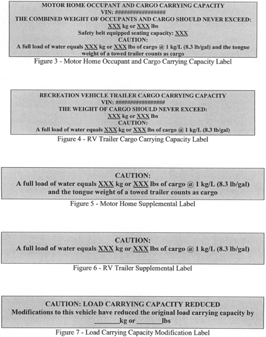 Replace the original, permanent RV load carrying capacity labels (Figures 3 and 4) and the placard (Figure 1) with the same labels/placard containing correct vehicle capacity weight values. If the manufacturer selects S9.3.3(b), the temporary RV load carrying capacity labels (Figures 3 and 4) must also be replaced with the same labels containing correct vehicle capacity weight values.