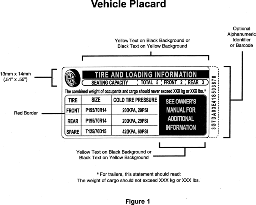 Placard. Each vehicle, except for a trailer or incomplete vehicle, shall show the information specified in S4.3 (a) through (g), and may show, at the manufacturer's option, the information specified in S4.3 (h) and (i), on a placard permanently affixed to the driver's side B-pillar. In each vehicle without a driver's side B-pillar and with two doors on the driver's side of the vehicle opening in opposite directions, the placard shall be affixed on the forward edge of the rear side door. If the above locations do not permit the affixing of a placard that is legible, visible and prominent, the placard shall be permanently affixed to the rear edge of the driver's side door. If this location does not permit the affixing of a placard that is legible, visible and prominent, the placard shall be affixed to the inward facing surface of the vehicle next to the driver's seating position. This information shall be in the English language and conform in color and format, not including the border surrounding the entire placard, as shown in the example set forth in Figure 1 in this standard. At the manufacturer's option, the information specified in S4.3 (c), (d), and, as appropriate, (h) and (i) may be shown, alternatively to being shown on the placard, on a tire inflation pressure label which must conform in color and format, not including the border surrounding the entire label, as shown in the example set forth in Figure 2 in this standard. The label shall be permanently affixed and proximate to the placard required by this paragraph. The information specified in S4.3 (e) shall be shown on both the vehicle placard and on the tire inflation pressure label (if such a label is affixed to provide the information specified in S4.3 (c), (d), and, as appropriate, (h) and (i)) may be shown in the format and color scheme set forth in Figures 1 and 2. If the vehicle is a motor home and is equipped with a propane supply, the weight of full propane tanks must be included in the vehicle's unloaded vehicle weight. If the vehicle is a motor home and is equipped with an on-board potable water supply, the weight of such on-board water must be treated as cargo.