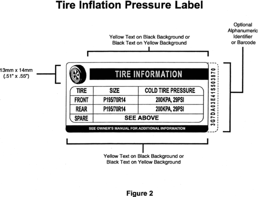 Vehicle manufacturer's recommended cold tire inflation pressure for front, rear and spare tires, subject to the limitations of S4.3.4. For full size spare tires, the statement “see above” may, at the manufacturer's option replace manufacturer's recommended cold tire inflation pressure. If no spare tire is provided, the word “none” must replace the manufacturer's recommended cold tire inflation pressure.