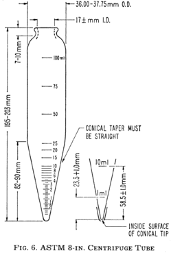 Centrifuge tube. Cone-shaped centrifuge tubes conforming to the dimensions given in Figure 6, and made of thoroughly annealed glass. The graduations shall be numbered as shown in Figure 6, and shall be clear and distinct. Scale-error tolerances and smallest graduations between various calibration marks are given in Table V and apply to calibrations made with air-free water at 20 °C. (68 °F.).