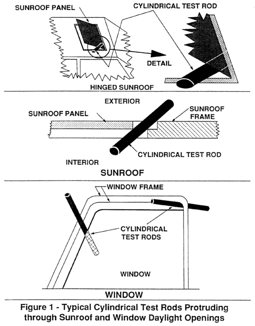 Test procedure for testing power-operated window, partition, or roof panel systems designed to detect obstructions by physical contact or by light beam interruption: Place the test rod of the type specified in S8.1 or S8.2, as appropriate, through the window, partition, or roof panel opening from the inside of the vehicle such that the cylindrical surface of the rod contacts any part of the structure with which the window, partition, or roof panel mates. Typical placements of test rods are illustrated in Figure 1. Attempt to close the power window, partition, or roof panel by operating the actuation device provided in the vehicle for that purpose.