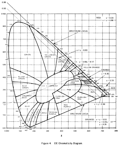 The color of the red reflex reflective material on the warning device shall have the following characteristics, both before and after the warning device has been conditioned in accordance with S6.1, when the source of illumination is a lamp with a tungsten filament operating at 2856° Kelvin color temperature. Expressed in terms of the International Commission on Illumination (CIE) 1931 standard colorimetric observer system (CIE chromaticity diagram, Figure 4), the chromaticity coordinates of the red reflex reflective material shall lie within the region bounded by the spectrum locus and the lines on the diagram defined by the following equations: