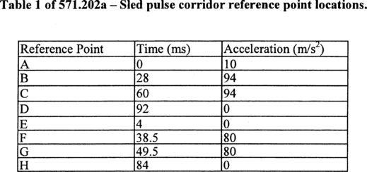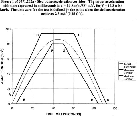 Remove the tires, wheels, fluids, and all unsecured components. Remove or rigidly secure the engine, transmission, axles, exhaust, vehicle frame and any other vehicle component necessary to assure that all points on the acceleration vs. time plot measured by an accelerometer on the dynamic test platform fall within the corridor described in Figure 1 and Table 1.