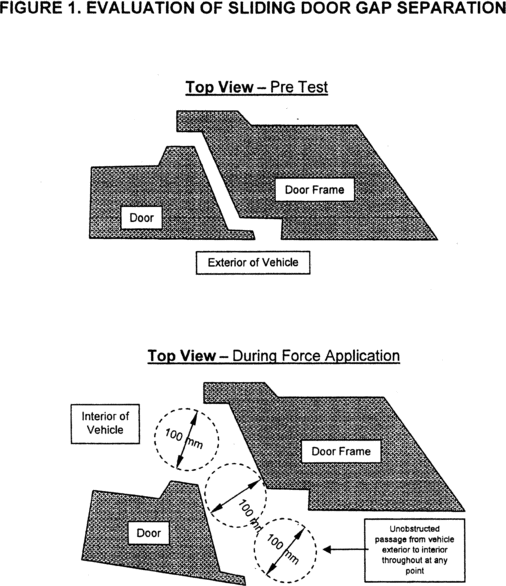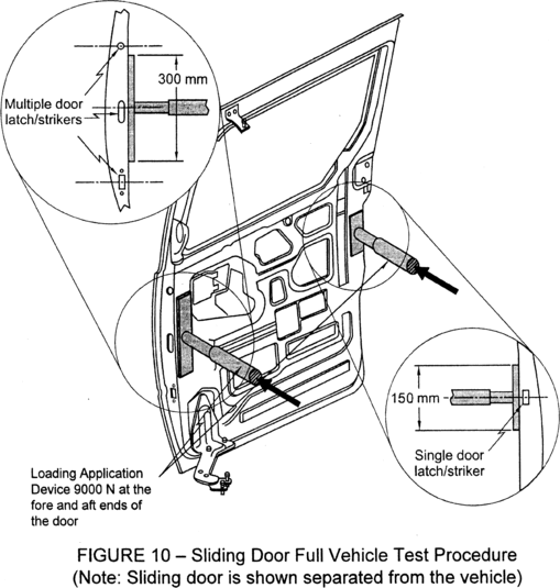Sliding Side Doors. Compliance with S4.3 shall be demonstrated by applying an outward transverse load of 8,900 Newtons (2,000 pounds) to the load-bearing members at the opposite edges of the door (17,800 Newtons (4,000 pounds) total). The demonstration may be performed either in the vehicle or with the door retention components in a bench test fixture.