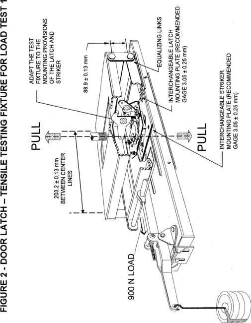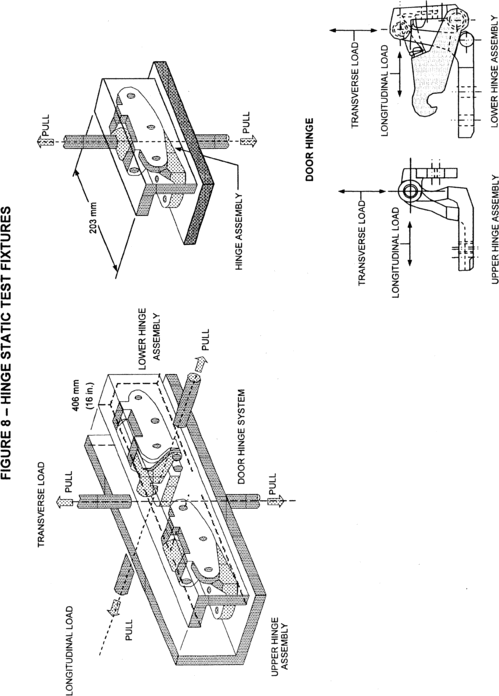 Transverse Load. Attach the test fixture illustrated in Figure 8 to the mounting provisions of the hinge. Hinge attitude is configured to simulate the vehicle position (door fully closed) relative to the hinge centerline. For test purposes, the load is to be applied equidistant between the linear center of the engaged portions of the hinge pin and through the centerline of the hinge pin in the transverse vehicle direction. Apply the test load at a rate not to exceed 5 mm/min until the required load has been achieved. Failure consists of a separation of either hinge. Record maximum load achieved.