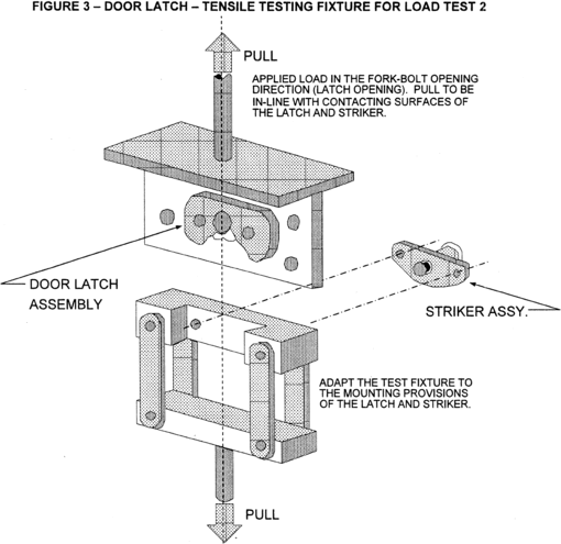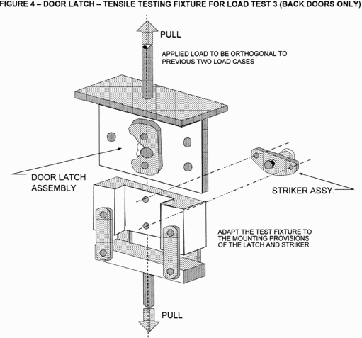At least one door latch system, when in the fully latched position, shall not separate when a load of 9,000 N is applied in the fork-bolt opening direction and parallel to the face of the latch when tested in accordance with S5.2.1.2.