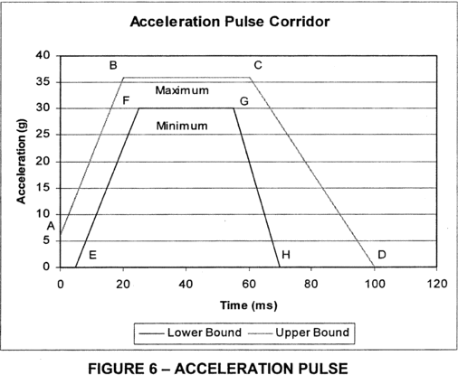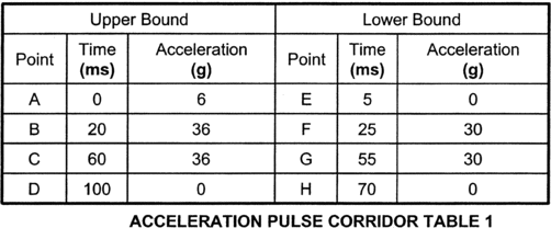 Maintaining a minimum acceleration level of 30 g for a period of at least 30 ms, while keeping the recorded acceleration within the pulse corridor defined in Table 1 and Figure 6, accelerate the acceleration device in the following directions: