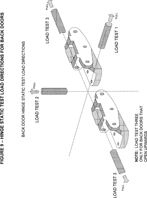 Not separate when a load of 9,000 N is applied in the direction of the axis of the hinge pin (Load Test Three — only for back doors that open in a vertical direction).