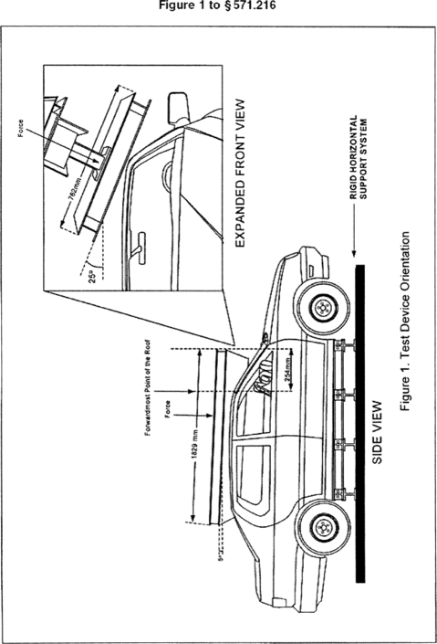 When the test device described in S6 is used to apply a force to a vehicle's roof in accordance with S7, first to one side of the roof and then to the other side of the roof: