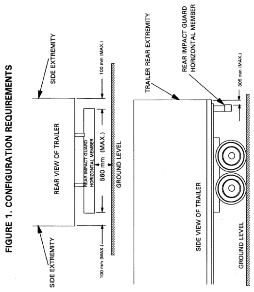 Guard width. The outermost surfaces of the horizontal member of the guard shall extend outboard to within 100 mm of the longitudinal vertical planes that are tangent to the side extremities of the vehicle, but shall not extend outboard of those planes. See Figure 1 of this section.
