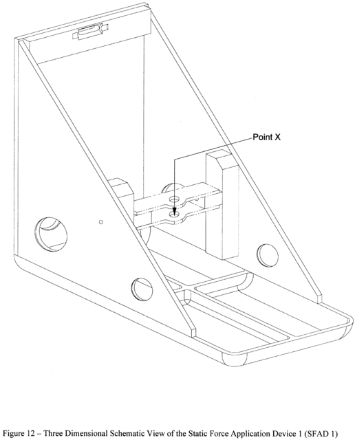 Forces in the forward direction shall be applied with an initial force application angle of 10 ±5 degrees above the horizontal. Lateral forces shall be applied horizontally (0° ±5°). A pre-load force of 500 N ±25 N shall be applied at the prescribed loading point (point X) in Figure 17. The force shall be increased to 8 kN ±0.25 kN for forward tests, or to 5 kN ±0.25 kN for lateral tests. Full application of the force shall be achieved within a time period of 2 seconds or less. The force shall be maintained for a period of 0.25 seconds ±0.05 seconds.