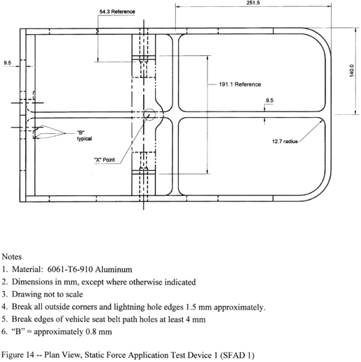 A rearward force of 135 N ±15 N shall be applied to the center of the lower front crossbar of SFAD 2 to press the device against the seat back as the fore-aft position of the rearward extensions of the SFAD is adjusted to remove any slack or tension. Forces shall be applied to SFAD 2 in forward and lateral directions according to the following table.