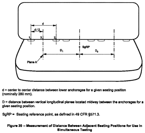 If anchorages for more than one child restraint anchorage system are installed in the vehicle seat assembly and not directly into the vehicle structure, the forces described in S15.3 may, at the agency's option, be applied simultaneously to SFADs engaged with the anchorages. However, that force may not be applied simultaneously to SFADs engaged at any two adjacent seating positions whose midpoints are less than 400 mm apart, as measured in accordance with S15.3.3(a)(1) and (2) and Figure 20.