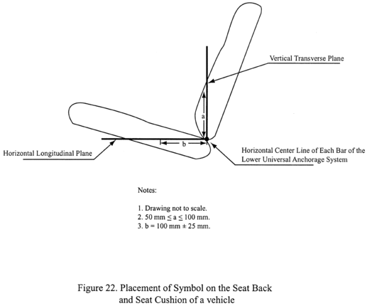 The anchorage bars are located at the vehicle seating position with the aid of and with respect to the CRF rearward extensions, with the CRF placed against or near the vehicle seat back. With the CRF attached to the anchorages and resting on the seat cushion, the bottom surface shall have attitude angles within the limits in the following table, angles measured relative to the vehicle horizontal, longitudinal and transverse reference planes.