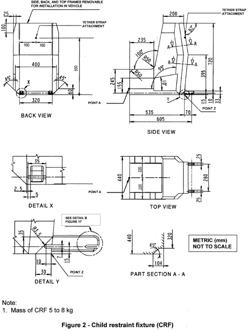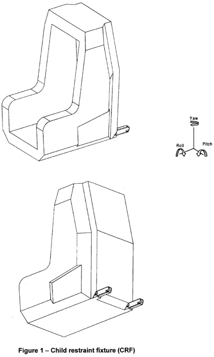 Child restraint fixture (CRF) means the fixture depicted in Figures 1 and 2 of this standard that simulates the dimensions of a child restraint system, and that is used to determine the space required by the child restraint system and the location and accessibility of the lower anchorages.