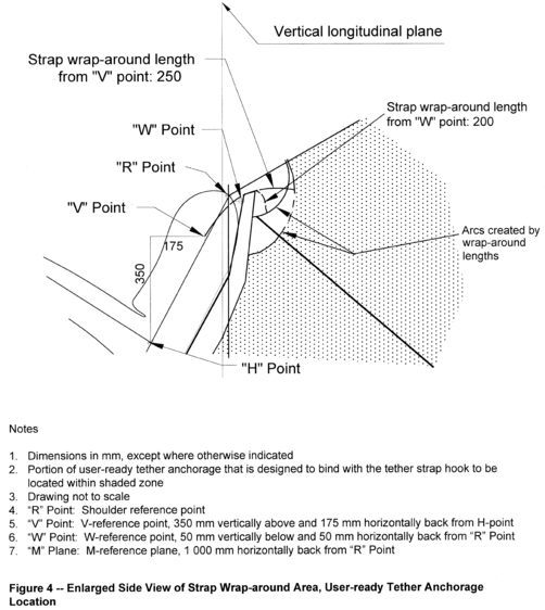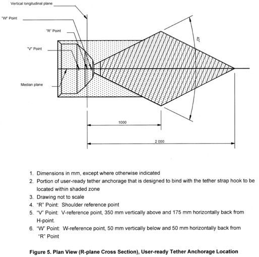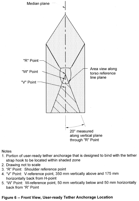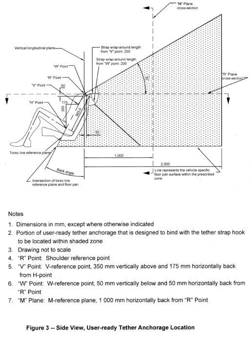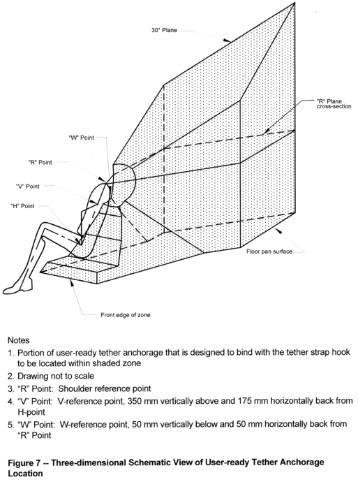 Subject to S6.2.1.1 and S6.2.1.2, the part of each tether anchorage that attaches to a tether hook must be located within the shaded zone shown in Figures 3 to 7 of this standard of the designated seating position for which it is installed. The zone is defined with reference to the seating reference point (see §571.3). (For purposes of the figures, “H Point” is defined to mean seating reference point.) A tether anchorage may be recessed in the seat back, provided that it is not in the strap wrap-around area at the top of the vehicle seat back. For the area under the vehicle seat, the forwardmost edge of the shaded zone is defined by the torso line reference plane.