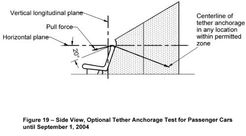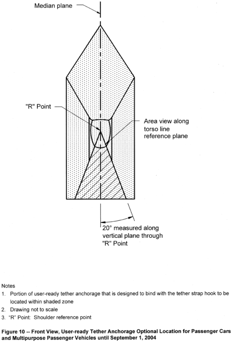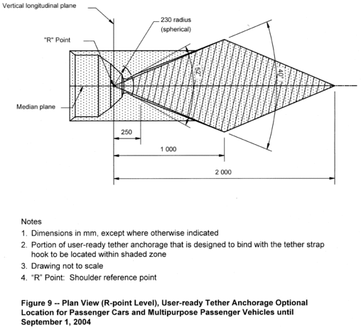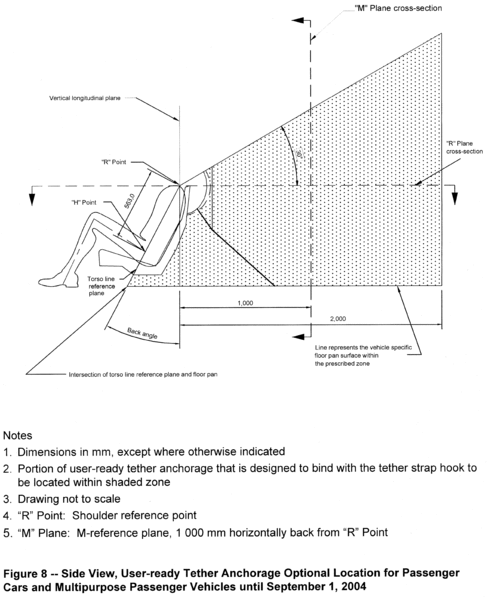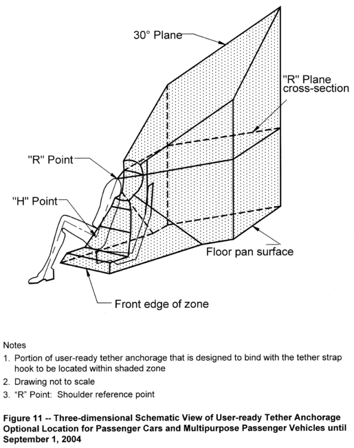 In the case of passenger cars and multipurpose passenger vehicles manufactured before September 1, 2004, the part of each user-ready tether anchorage that attaches to a tether hook may, at the manufacturer's option (with said option selected prior to, or at the time of, certification of the vehicle), instead of complying with S6.2.1, be located within the shaded zone shown in Figures 8 to 11 of this standard of the designated seating position for which it is installed, relative to the shoulder reference point of the three dimensional H-point machine described in section 3.1 of SAE Standard J826-1992 (incorporated by reference, see §571.5) such that —
