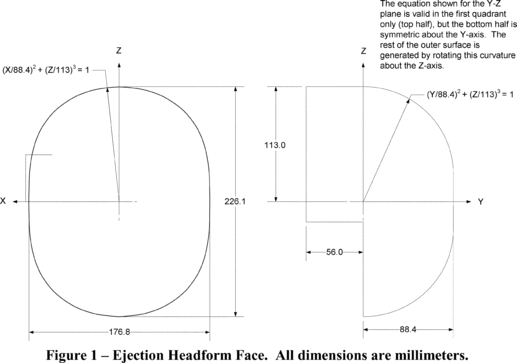 Ejection headform dimensions. The ejection headform has the dimensions shown in Figure 1 and is depicted in the “Parts List; Ejection Mitigation Headform Drawing Package,” December 2010, and the “Parts List and Drawings; Ejection Mitigation Headform Drawing Package,” December 2010 (incorporated by reference; see §571.5).