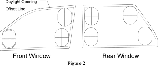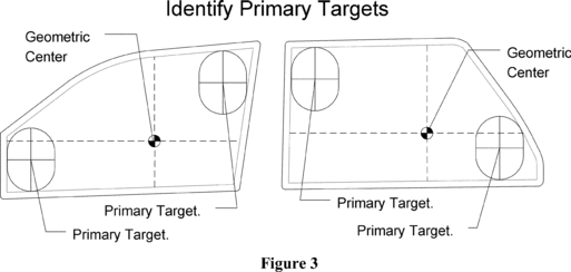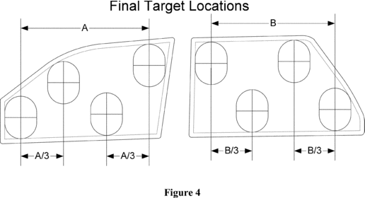 Front windows. Measure the horizontal distance between the centers of the primary targets. For a side daylight opening forward of the B-pillar, place one secondary target center rearward of the forward primary target by one-third of the horizontal distance between the primary target centers and tangent with upper portion of the offset-line. Place another secondary target center rearward of the forward primary target by two-thirds of the horizontal distance between the primary target centers and tangent with the lower portion of the offset-line (see figure 4) (figure provided for illustration purposes).