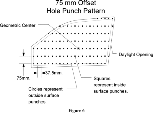 Continue the procedure with the center punch by moving rearward in the grid until the end of a row is reached. When the end of a row is reached, move to the forward-most mark on the next higher row and continue the procedure. Continue in this pattern until the procedure is conducted at each marked location on the inside surface of the glazing.
