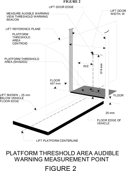The intensity of the audible warning and visibility of the visual warning required by S6.1.2 and S6.1.3 is measured/observed at a location 914 mm (3 ft) above the center of the platform threshold area. (See Figure 2).