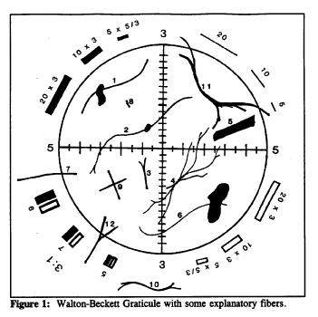 After the polarization direction has been identified in the field of view, move the particle of interest to the center of the field of view and align it with the polarization direction. For fibers, align the fiber along this direction. Note the angular reading of the rotating stage. Looking at the particle, rotate the stage until the fiber goes dark or "blinks out". Again note the reading of the stage. The difference in the first reading and the second is an angle of extinction.