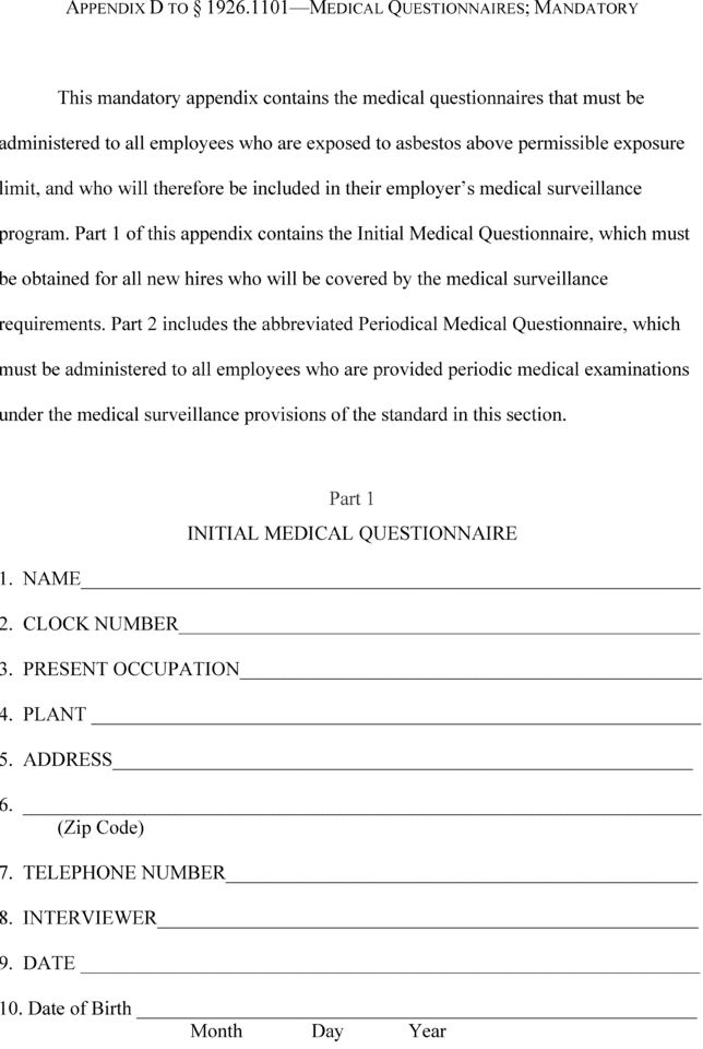 Asbestos, Code of Federal Regulations, 29 CFR 1910.1001 and 29 CFR 1926.58.