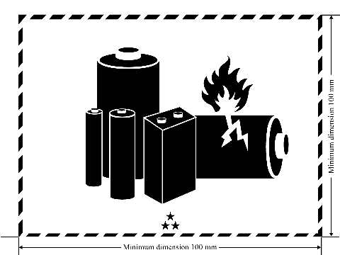 The mark must be in the form of a rectangle or a square with hatched edging. The mark must be not less than 100 mm (3.9 inches) wide by 100 mm (3.9 inches) high, and the minimum width of the hatching must be 5 mm (0.2 inches), except marks of 100 mm (3.9 inches) wide by 70 mm (2.8 inches) high may be used on a package containing lithium batteries when the package is too small for the larger mark;