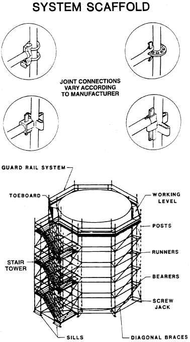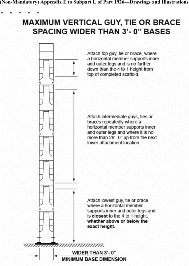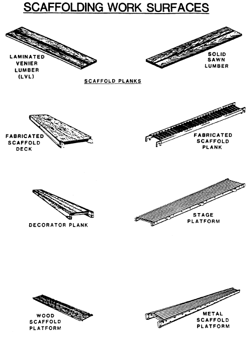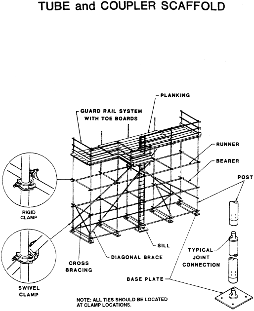 This Appendix provides drawings of particular types of scaffolds and scaffold components, and graphic illustrations of bracing patterns and tie spacing patterns.
