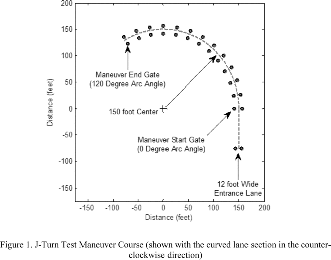 The time measurement for the J-Turn test maneuver is referenced to “time zero”, which is defined as the instant the center of the front tires of the vehicle reach the start gate, the line within the lane at zero degrees of radius arc angle. The completion of the maneuver occurs at the instant the center of the front tires of the vehicle reach the end gate, which is the line within the lane at 120 degrees of radius arc angle.