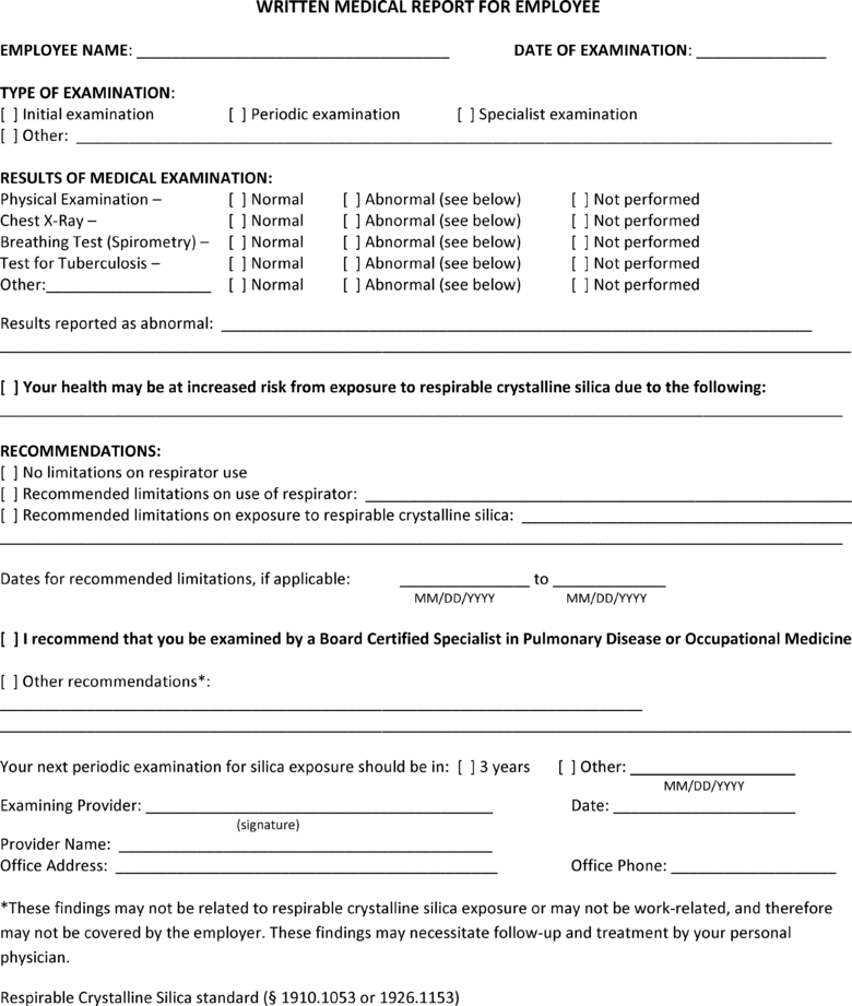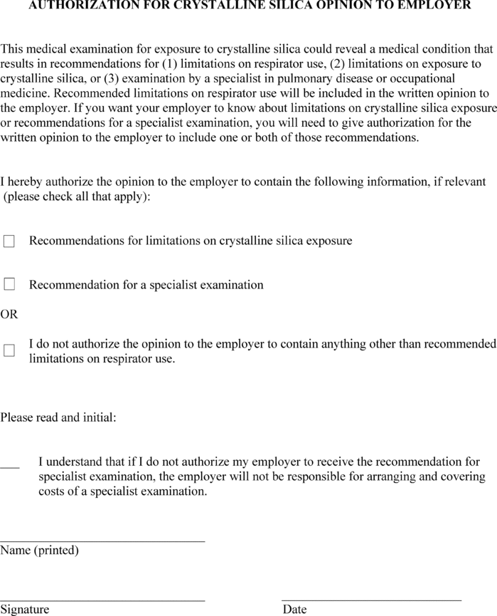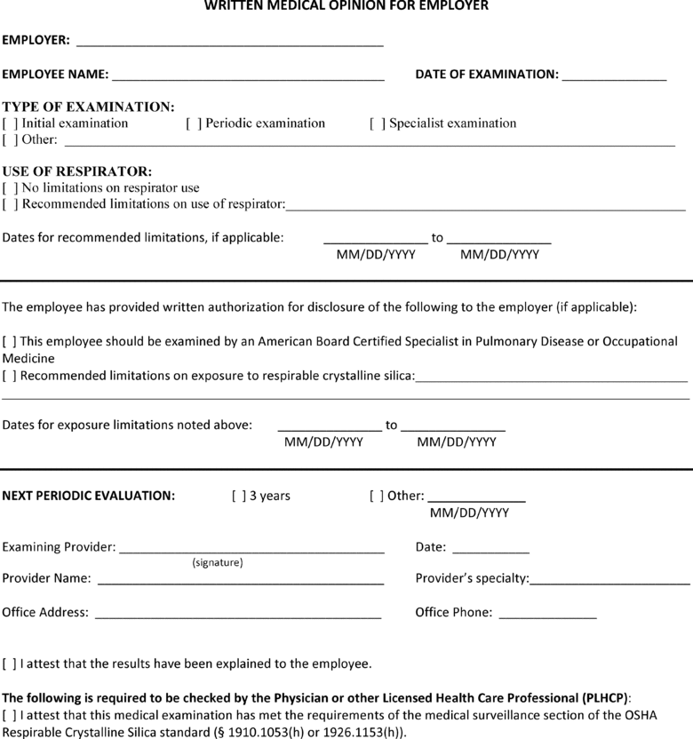 The standard also places limitations on the information that the Board Certified Specialist in Pulmonary Disease or Occupational Medicine can provide to the employer without the employee's written authorization. The Specialist's written medical opinion for the employer, like the PLHCP's opinion, is limited to (and must contain): The date of the examination and any recommended limitations on the employee's use of respirators. If the employee provides written authorization, the written medical opinion can (and must) also contain any limitations on the employee's exposure to respirable crystalline silica.