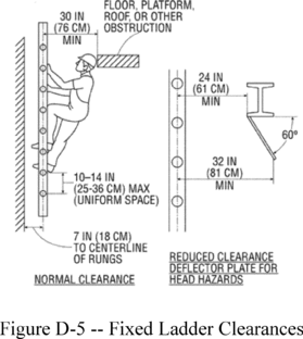 A minimum perpendicular distance of 30 inches (76 cm) from the centerline of the steps or rungs to the nearest object on the climbing side. When unavoidable obstructions are encountered, the minimum clearance at the obstruction may be reduced to 24 inches (61 cm), provided deflector plates are installed (see Figure D-5 of this section).