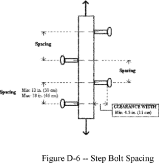 Step bolts are uniformly spaced at a vertical distance of not less than 12 inches (30 cm) and not more than 18 inches (46 cm) apart, measured center to center (see Figure D-6 of this section). The spacing from the entry and exit surface to the first step bolt may differ from the spacing between the other step bolts;