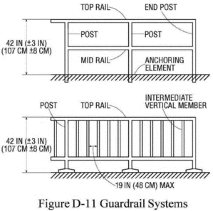 Guardrail systems are capable of withstanding, without failure, a force of at least 200 pounds (890 N) applied in a downward or outward direction within 2 inches (5 cm) of the top edge, at any point along the top rail.