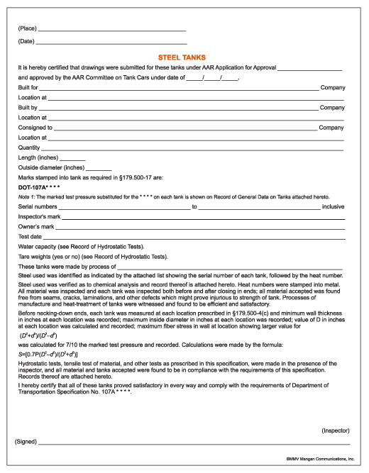 Before a tank car is placed in service, the party assembling the completed car shall furnish to car owner, Bureau of Explosives, and the Secretary, Mechanical Division, Association of American Railroads, a report in proper form certifying that tanks and their equipment comply with all the requirements of this specification and including information as to serial numbers, dates of tests, and ownership marks on tanks mounted on car structure.