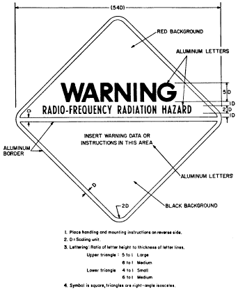 The warning symbol for radio frequency radiation hazards shall consist of a red isosceles triangle above an inverted black isosceles triangle, separated and outlined by an aluminum color border. The words "Warning — Radio-Frequency Radiation Hazard" shall appear in the upper triangle. See figure G-11.